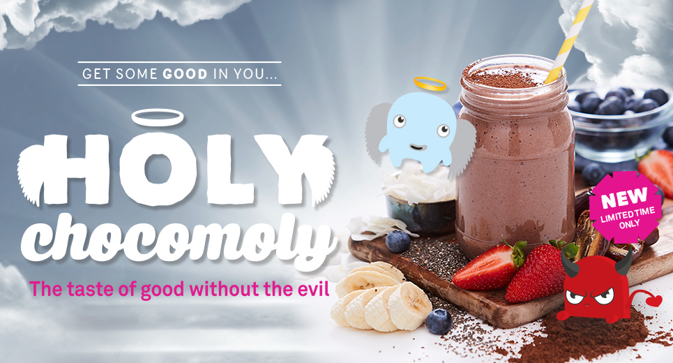 Made with 100% cocoa powder, chia seeds (our superman of superfoods), whole blended banana, strawberries, blueberries and dates, with whey protein, coconut milk, coconut water, milk and ice – the answer to your chocolate smoothie prayers!