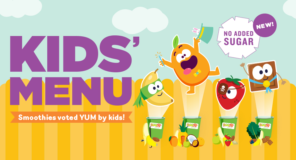 Boost Juice are now blending an exciting KIDS MENU! This has been developed with growing bodies in mind! Voted ‘Yum’ by kids and with no added sugar, these 4 new drinks have the added benefit of vegetables or superfoods. They’re a great way to get more fruit and vegetables into kids’ diets!